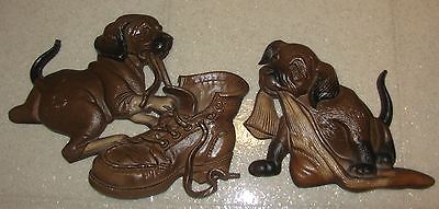 Vintage MCM pair 1975 Sexton Metal Wall Plaques Puppy Puppies Dog Hunting Boot