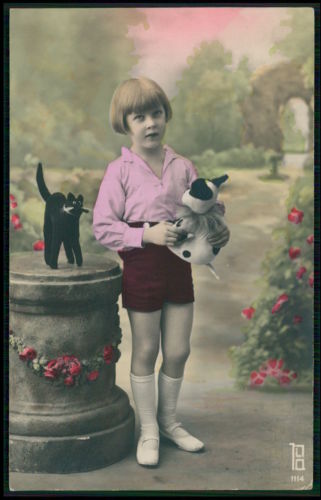 Title (ebay affiliate link): child boy with steiff black Cat & Dog toy original old c1920s photo postcard