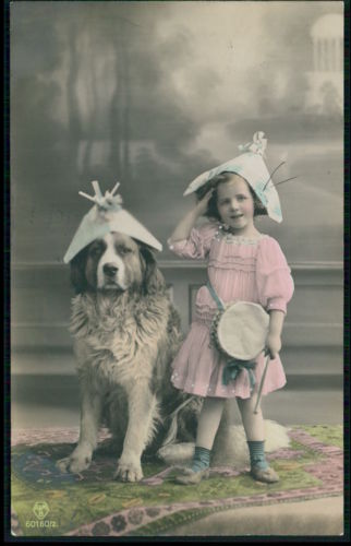 Title (ebay affiliate link): Child girl paper hat & Drum & Saint Bernard Dog original c1910s photo postcard