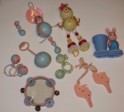 Title (ebay affiliate link): Vintage BABY CRIB & OTHER TOYS - Pink & Blue - Rattles, Mitten Clips, Tambourine