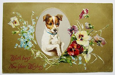 SALE Puppy DOG Winsch Back NEW YEAR Wishes Pansies Gold Postcard