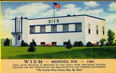 Title (ebay affiliate link): RPPC Colored Litho Linen Medford Wisconsin Radio Station WIGM/1945