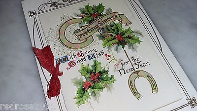 B B LONDON old HOLIDAY NEW YEAR postcard MOTHER OF PEARL - FOLD OUT real ribbon