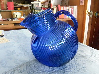 Title (ebay affiliate link): Vintage Cobalt Blue Ball Shaped Hazel Atlas Pitcher Tilted Ribbed