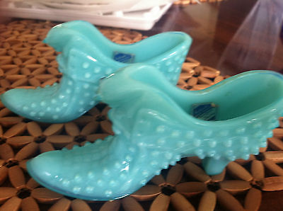 Title (ebay affiliate link): FENTON Blue Milkglass Hobnail Shoes With Original Fenton Tags Lot of 2!!!