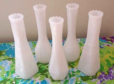 Title (ebay affiliate link): Lot 5 Vintage White Milk Glass Bud Vases 9" Wedding Flowers Florist
