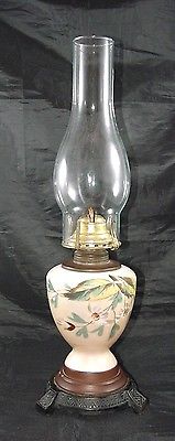 Antique Victorian Oil Lamp w/Cast Iron Base & Chimney Floral Design Milk Glass