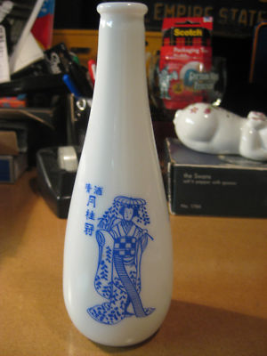 White Milk Glass Sake Bottle Gekkeikan Blue Geisha Girl