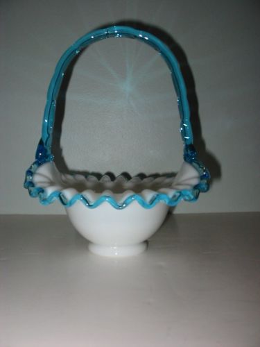 Vintage Fenton Milk Glass Aqua Blue Crest Ruffled Basket