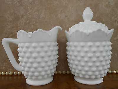 Fenton 3 pce White Milk Glass Hobnail Creamer Pitcher Sugar Bowl w/lid/scalloped