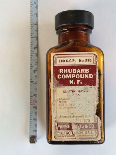 Title (ebay affiliate link): Parke-Davis Rhubarb Compound Pills, Full Antique Medicine Bottle
