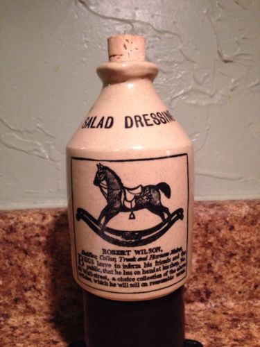 OLD STONEWARE SALAD DRESSING CROCK W/ CORK~ENGLAND 60 Wall Street Ny Horses