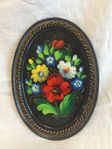 Title (ebay affiliate link): Flower Shaped Vintage Hand Painted Signed Floral Black Metal Russian Tole Tray