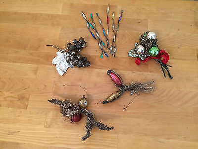 4 Vintage Handmade Tinsel Glass Bead Christmas Ornaments & 7 Metal Icicles