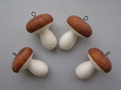 4 VINTAGE SPUN COTTON MUSHROOMS covered w/ Venetian Dew CHRISTMAS ORNAMENTS