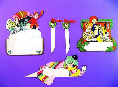 3 Vintage Art Deco Stand Up Christmas Place Cards & 2 Wreath Picks, Unused