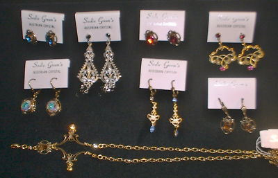 Sadie Green Antique Brass Crystal EARRINGS Necklace Lot