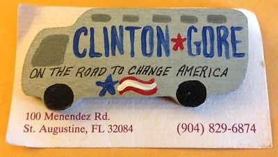 Title (ebay affiliate link): Clinton/Gore On The Road to Change America Wooden Campaign Pin Pinback Button