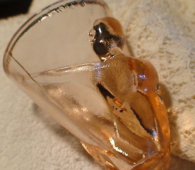 Title (ebay affiliate link): Vintage "Bottoms Up" Nude Art Deco Shot Glass Pink Depression Glass
