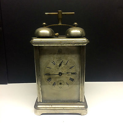 Antique Carriage Shelf Clock Alarm Key Wind Glass Side Brass & silverplate 1885