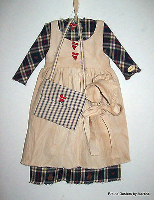 DOLL WALL DRESS-PINAFORE-BONNET-BOOK BAG OUTFIT -PRIMITIVE GRUNGY FOLK ART DECOR