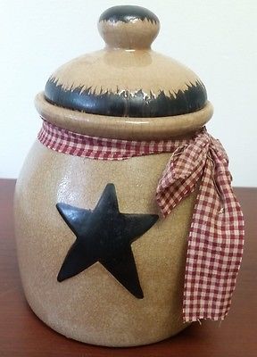Title (ebay affiliate link): Primitive Ceramic Crock w/ Lid ~ Crackle Dark Tan, Black Star ~ Country Decor