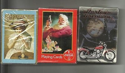 Title (ebay affiliate link): DR. PEPPER, HARLEY DAVIDSON, & SANTA COCA COLA SEALED DECKS OF PLAYING CARDS