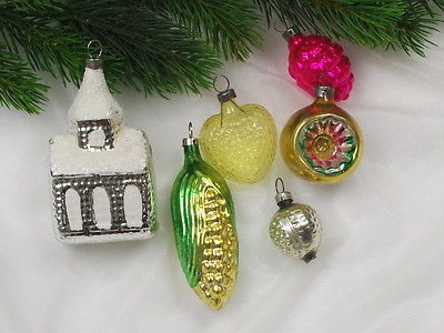 6 x Vintage Glass Christmas Ornaments, Church, Corn, Hearts, Cones, Spheres