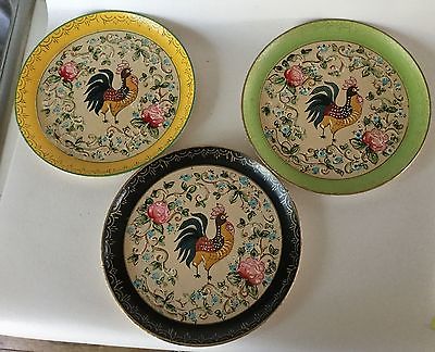 3 Vintage ISCO Paper Mache ROOSTER & ROSES Plate s Hand Painted Alcohol Proof 9"