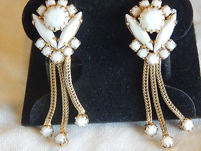 Vintage white milk glass navettes, mesh dangles clip earrings
