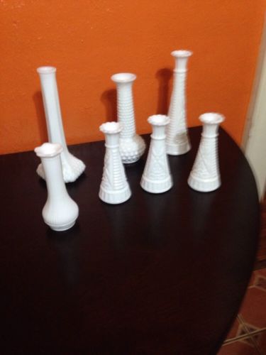 Title (ebay affiliate link): Lot of 7 White Milk Glass Flower Bud Vases Wedding Baby Shower Party Florist