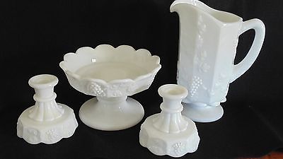 ANTIQUE MILK GLASS PITCHER FOOTED FRUIT BOWL & CANDLE HOLDER SET