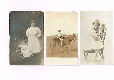 3 Card Lot, Real Photo (RPPC), People, Children, Boy on Donkey, Stroller!