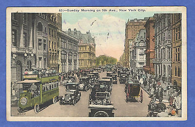 New York City Sunday Morning On 5th Ave Double Deck Bus Cars Postcard 1923