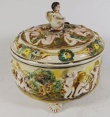 Vintage Capodimonte Lidded Bowl on Porcelain Feet Decorated with Cherub Figures