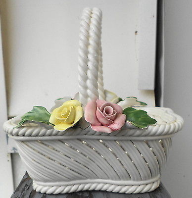 Title (ebay affiliate link): Nuova Capodimonte Woven Flower Basket Pink and Yellow Roses, ITALY