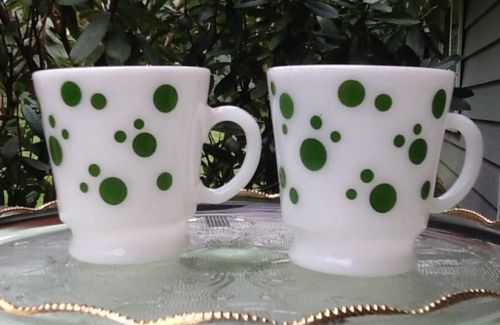 Title (ebay affiliate link): Vintage 2 Green POLKA DOT Milk Glass Hazel Atlas coffe tea mug cup RETRO Hippie