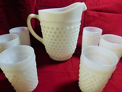 Anchor Hocking Milk Glass Hobnail Lot Pitcher 6 Glasses Drink Set Vintage 60's
