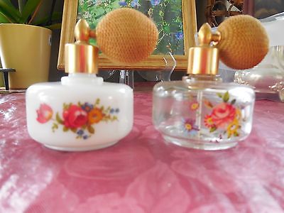 A PAIR ATOMIZER PERFUME BOTTLES ONE MILK GLASS ONE GLASS 2 1/2 TALL 2 1/4 WIDE