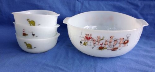 AWESOME Fire King Caveman Grog BC Comics Milk Glass Serving Bowl & 3 Small Bowls
