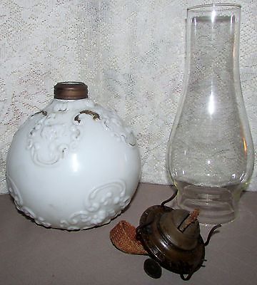 Antique Embossed Milk Glass Oil or Kerosene Lamp Ball Shape + Burner & Chimney