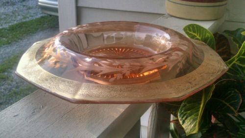 Title (ebay affiliate link): Etched Pink depression glass console bowl rolled down 8 panel 13" gold overlay