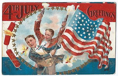4th July Greetings, Boy Waving Flag and Shooting Guns, Patriotic, c1910