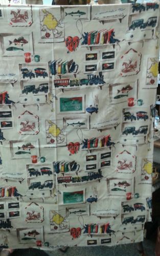 Title (ebay affiliate link): Vintage Rodmaker Vat Print barkcloth, 4 yrds, fish train cars maps keys horse
