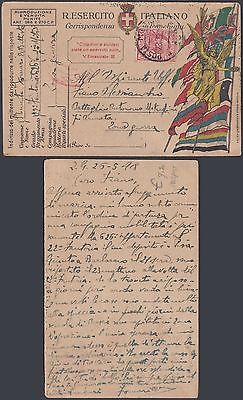 Italy 1918 Used stamp on censured army postcard to war zone....R5887