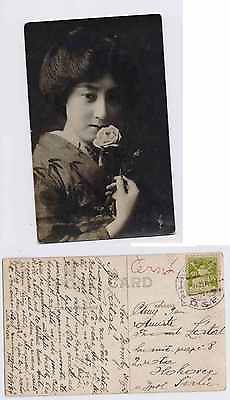 Japan lady MAIKO GEISHA with ROSE vintage real photo postcard 1923 used