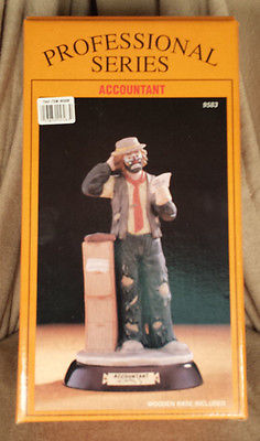 Emmett Kelly Jr Flambro Clown Figurine Accountant Porcelain 1990 Wood Base Box