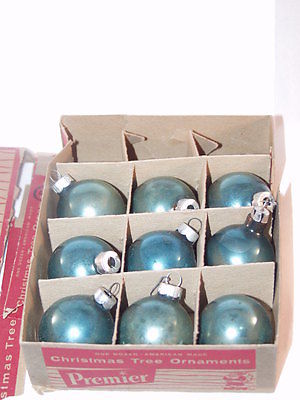 Title (ebay affiliate link): 9 Vintage (1940's) Premiere Glass Blue Christmas Tree Ornaments W/Original Box