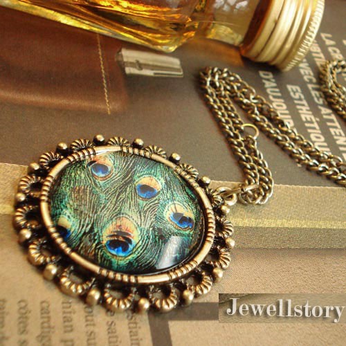 Title (ebay affiliate link): Antique Peacock Tail Feathers Round Pendant Necklace A+