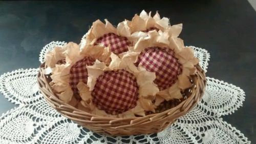 Title (ebay affiliate link): Set / 6 handmade primitive sunflower ornies / bowl fillers burgundy homespun